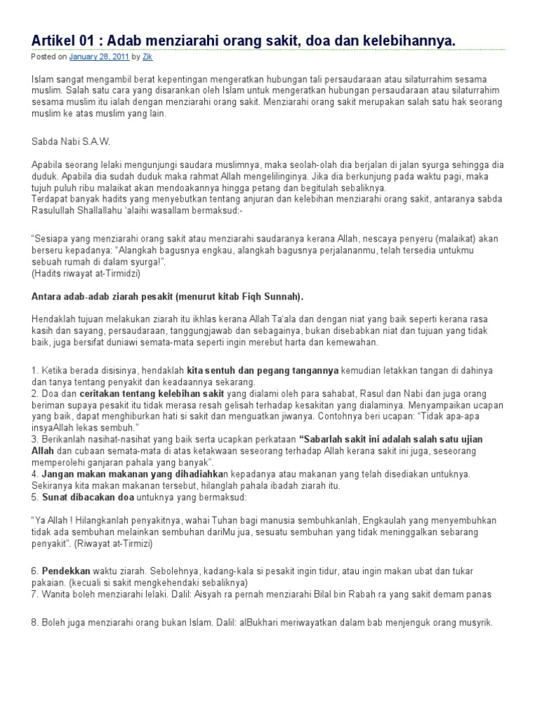 Hukum menziarahi orang sakit adalah sunat mu'akkadah iaitu sunat yang sangat dituntut. Tentu do'a akan memudahkan segalanya. Adab menziarahi orang sakit online worksheet for tahun 3. Orang yang menjenguk orang sakit akan mendapat pahala yang besar. Doa menjenguk orang sakit sesuai sunah lengkap arab latin arti adab dan keutamaannya.