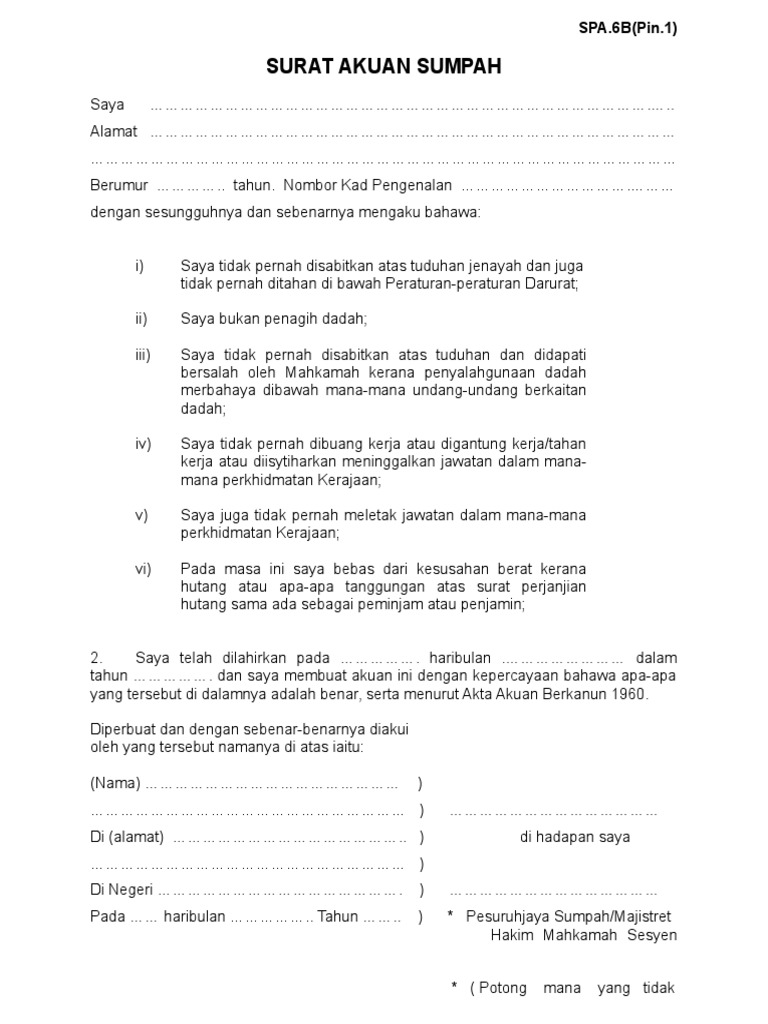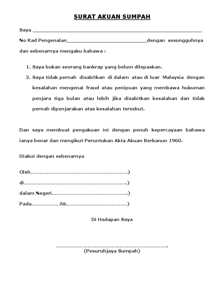 Surat Akuan Sumpah In English / Berguna kepada sesiapa yang ingin berkhidmat dalam kerajaan.. Dan saya membuat surat akuan sumpah ini dengan kepercayaan bahawa apa apa yang tersebut di dalamnya adalah benar serta menurut akta. Tujuan surat akuan pengenalan adalah satu dokumen perjalanan yang dikeluarkan kepada penduduk tetap malaysia yang tidak mempunyai taraf a. Tandatangan dan segala hal yang berkaitan dengan diri saya. Kad pengenalan (12 tahun ke atas) b. Savesave surat akuan sumpah for later.